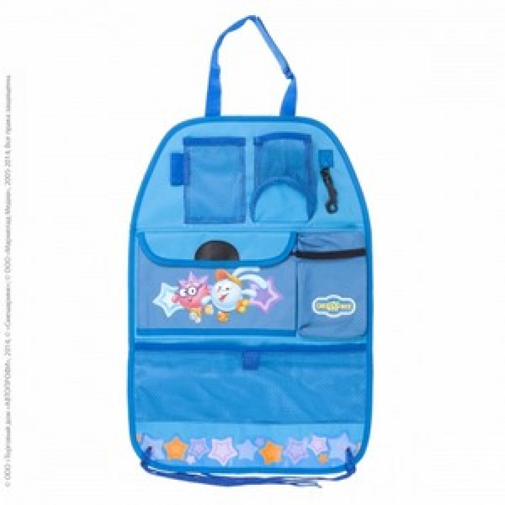 Защищает спинку сиденья от грязи и пыли Незаменима при перевозке детей в автокресле Легко моется и чистится Надежно фиксируется на автомобильном сидении ети в автомобиле остаются детьми, а значит, берут с собой много вещей и раскидывают их по салону Спасет в этой ситуации органайзер на спинку сиденья Складывать вещи в красивый органайзер, оформленный героями мультсериала "Смешарики", станет делом простым и даже приятным Эргономичные карманы органайзера имеют разные размеры, позволяя удобно расположить все необходимое: кармашек для ручки, карабин для мелочей, большой карман на липучке и карман на молнии для самых важных вещей, а также сетчатые карманы, в которых удобно помещаются бутылочки и другие предметы первой необходимости Надежное крепление позволяет крепко зафиксировать органайзер на спинке сиденья