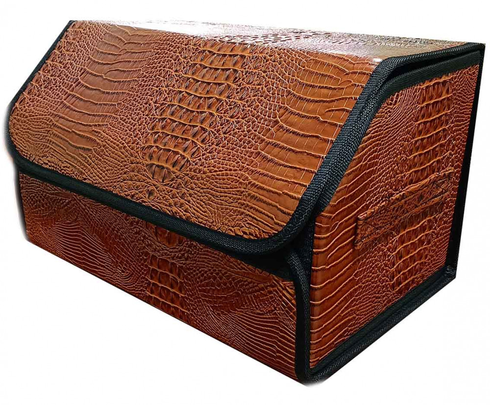 Черный органайзер в багажник Внешняя сторона из огнеупорного брезента, внутри — ковролин На крышке дополнительный отсек на молниях Есть ручка для переноски Органайзер пригоден для хранения инструментов, компрессора, принадлежностей для охоты и рыбалки Размер 70х32х30 см