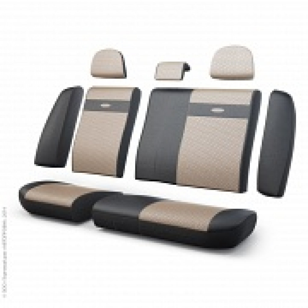 Чехлы на сиденье "Трансформер" TRS-002G - комплект из 11 изделий, предназначенный для установки на автомобильные сидения заднего ряда Он включает 3 небольших чехла, предназначенных для размещения на подголовниках заднего сидения, 2 чехла для спинок и 2 чехла на нижние подушки сидений Черно-светло бежевые чехлы удерживаются на сидениях при помощи застежек-молний и липучек и являются универсальными, подходя для заднего ряда сидений разных моделей авто