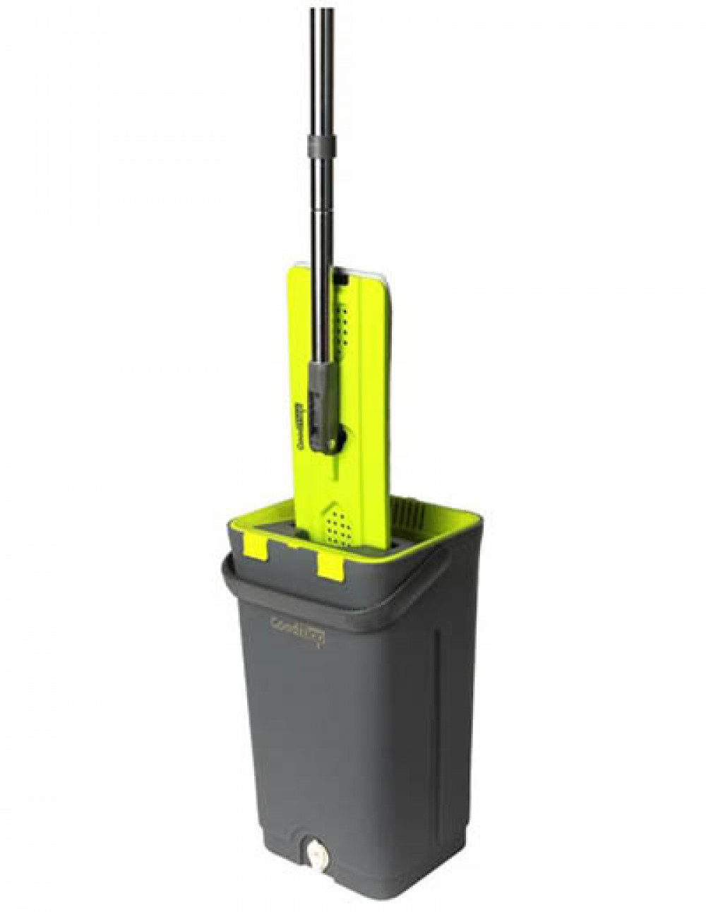 Комплект состоит из швабры и двухкамерного ведра и позволяет мыть и отжимать одной рукой без усилий Благодаря двум отсекам, вам не придётся смешивать чистую и грязную воду, а также прикасаться к грязной насадке руками