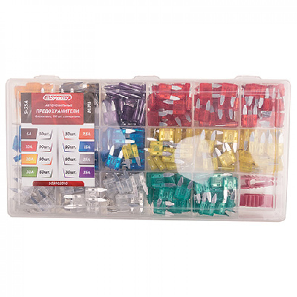 Предохранитель флажковый MINI набор 510шт 5-35А в пластиковой коробке SKYWAY- - набор пластмассовых предохранителей, предназначены для защиты бортовой электрической цепи автомобиля от перегрева и коротких замыканий Изготовлены из термостойкой пластмассы с вставками из цинка Важнейшая деталь для Вашего автомобиля